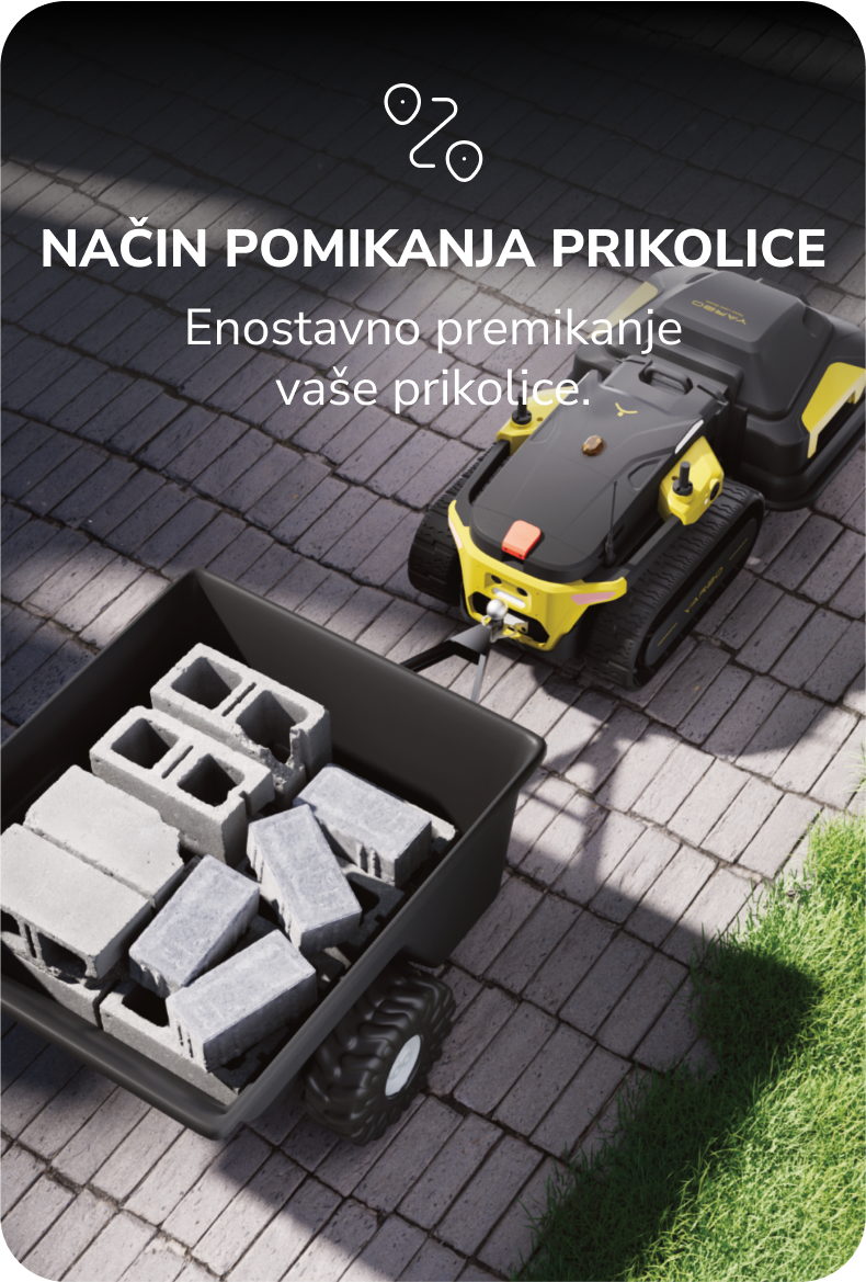 Yarbo Core in posamezni priključki so kompaktni in masivni, a vseeno narejeni tako, da se jih da enostavno priklopiti na Yarbo Core. Ko priključek nastavimo, ga potrebujemo le še potegniti k Yarbo Core enoti, ter pritrditi napajalni kabel. Enostavno. Za praktični prikaz si oglejte video: https://support.yarbo.com/portal/en/kb/articles/how-to-conne